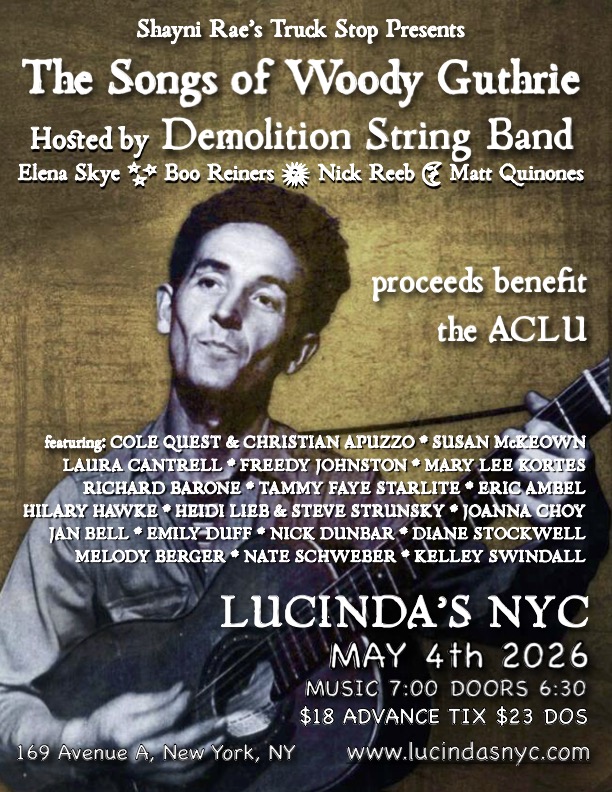 | Time: 7:00pm. Address: 169 Avenue A. Demolition String Band hosts a Night of Woody Guthrie music with cast of stellar guest performers. Proceeds will benefit the ACLU as they continue fighting for our rights and personal liberties as republicans try to shred Our Constitution. Buy Tickets | |||